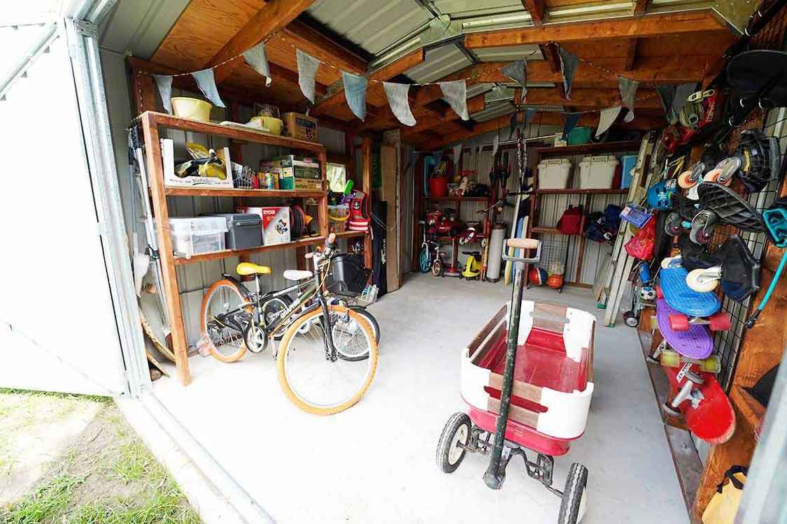 フローリングを敷かずバイク・自転車ガレージと収納として使用。 床がコンクリートのままなので汚れものも気にせず収納できます。 バイクガレージにするならSteel 2x4works設置が必要です。