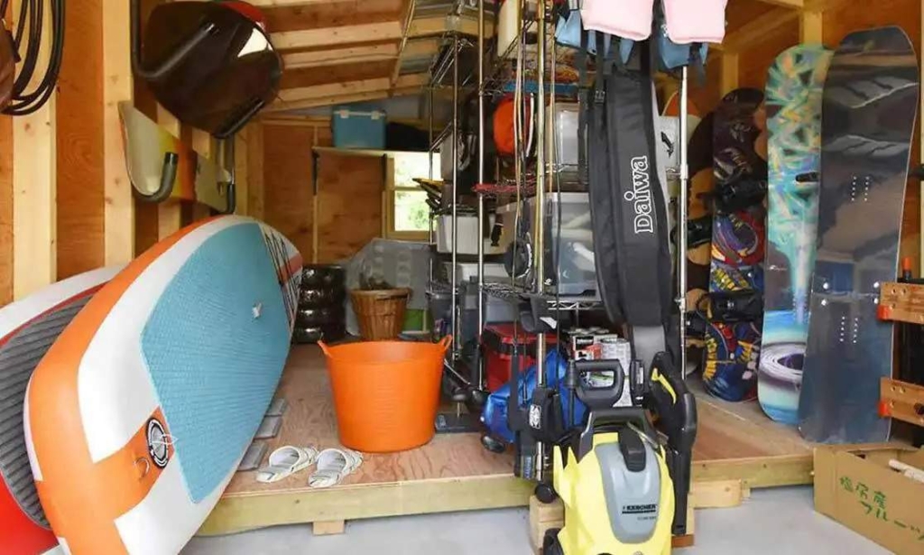 趣味のグッズを収納するだけでなく見せる収納。まるでサーフショップのよう。 ただ収納するだけではなく見せる収納にするだけでワクワクする空間が生まれます。