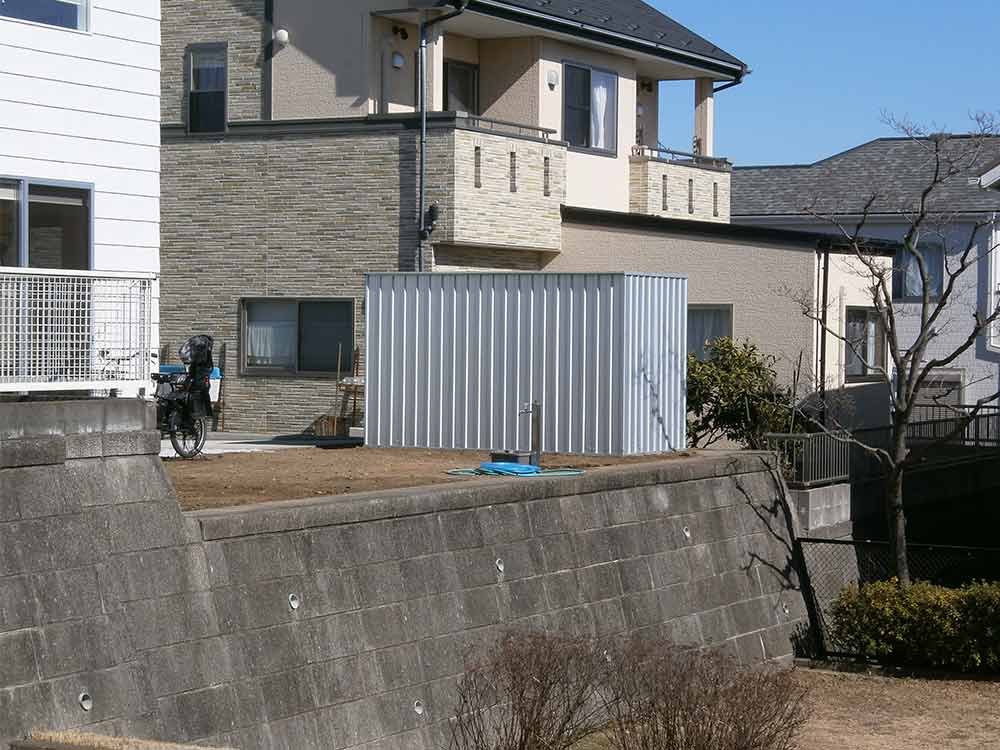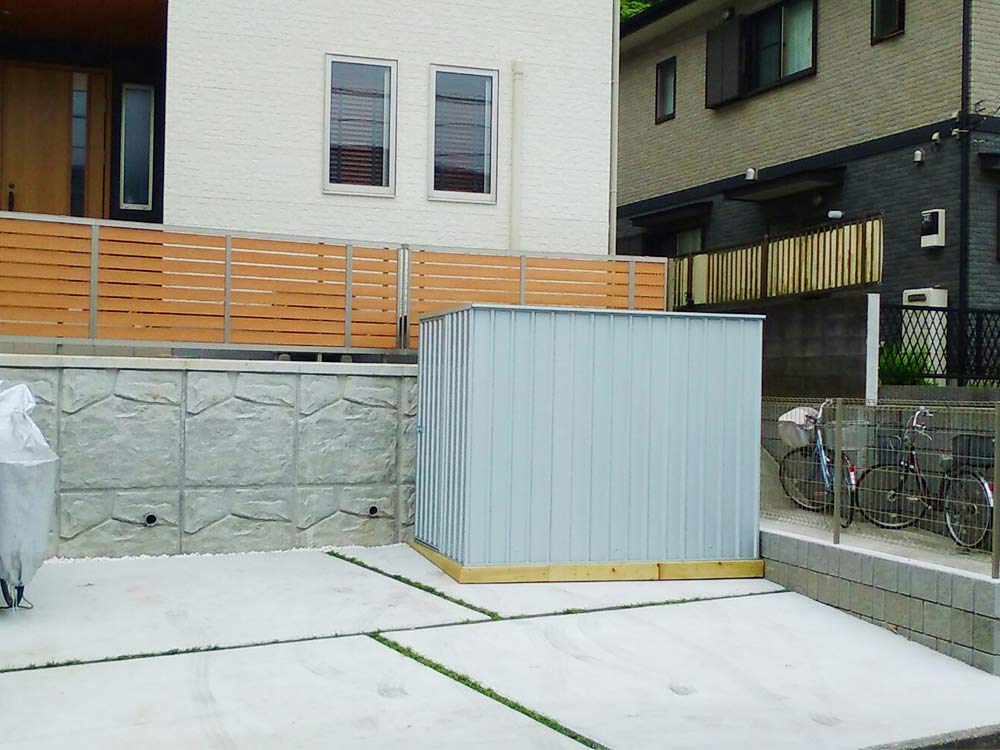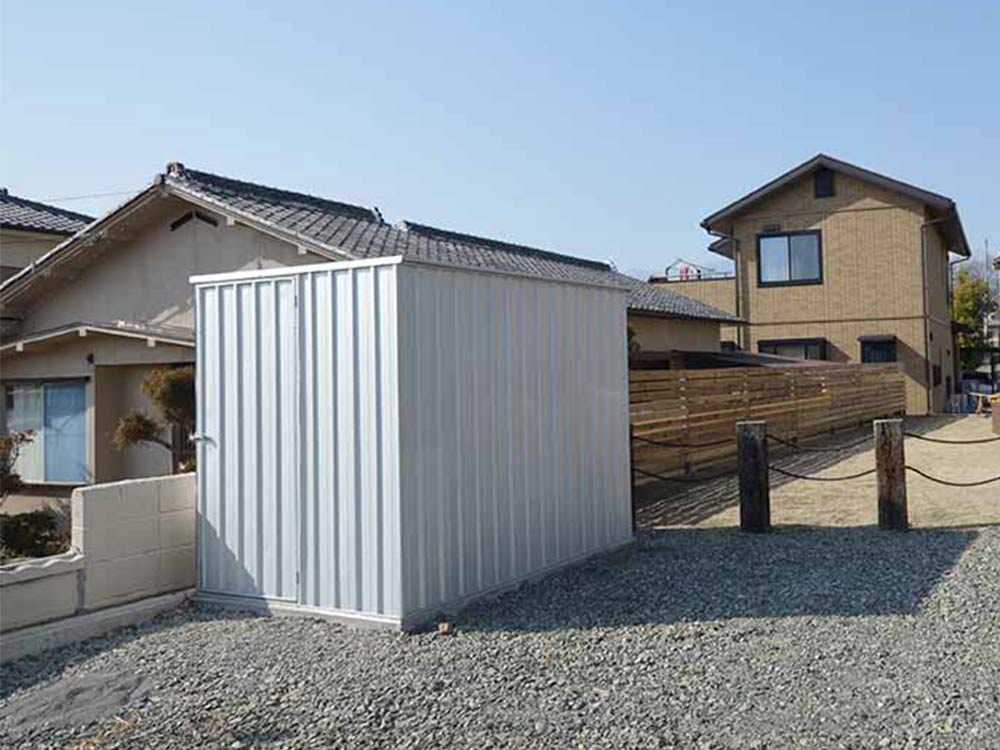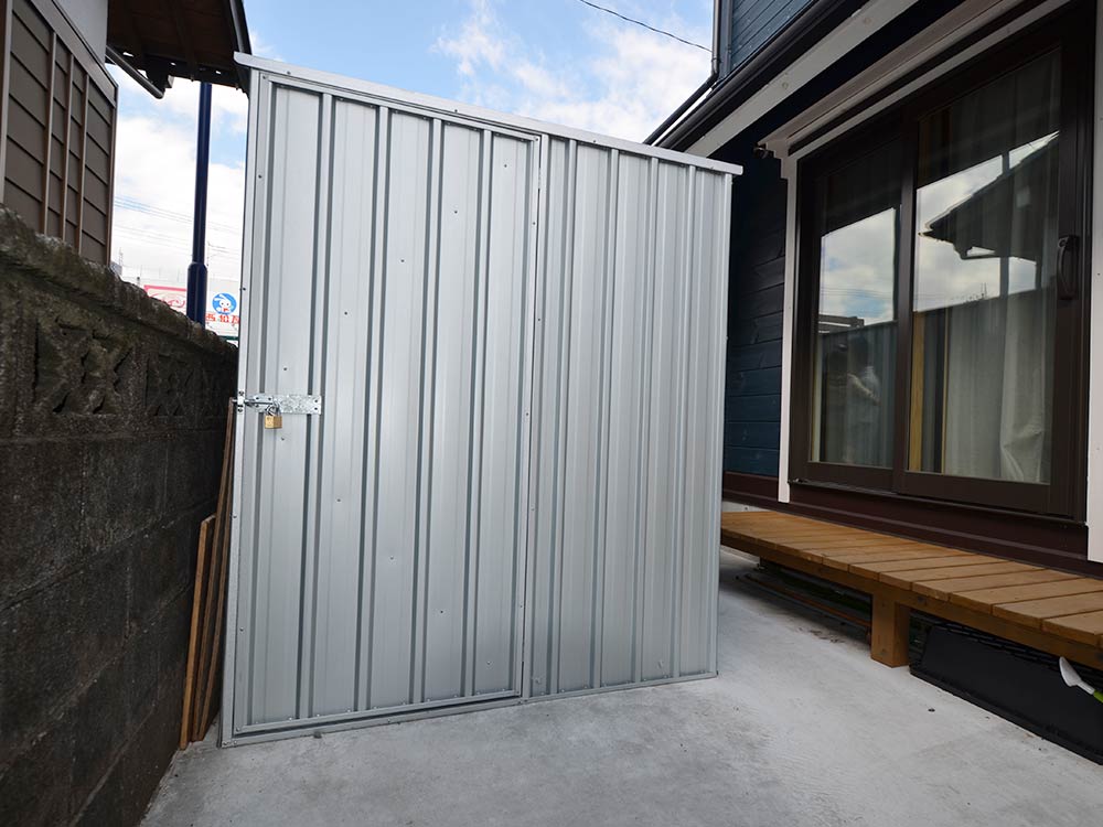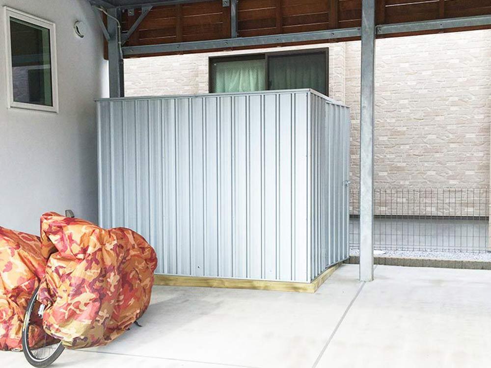 まるで海外のコンテナのような外観のユーロ物置®️バイシクルキューブを設置した施工写真をご覧ください。