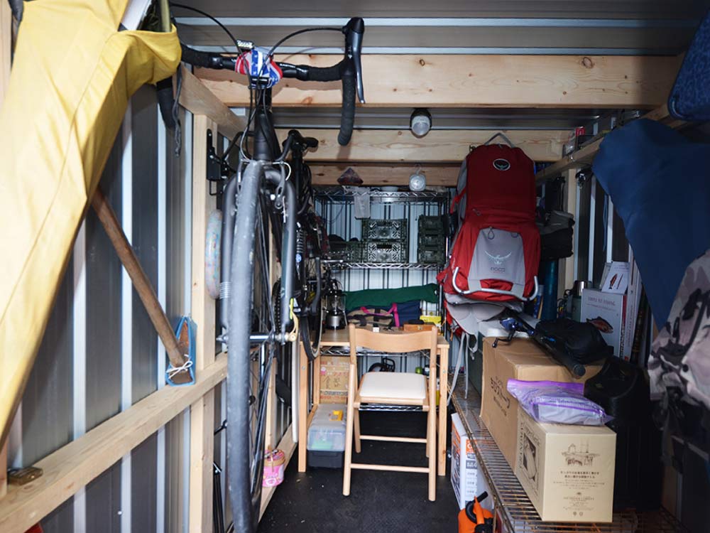 奥にあるテーブルで釣り道具のメンテナンスをしているそうです。自転車も収納して趣味部屋として使用