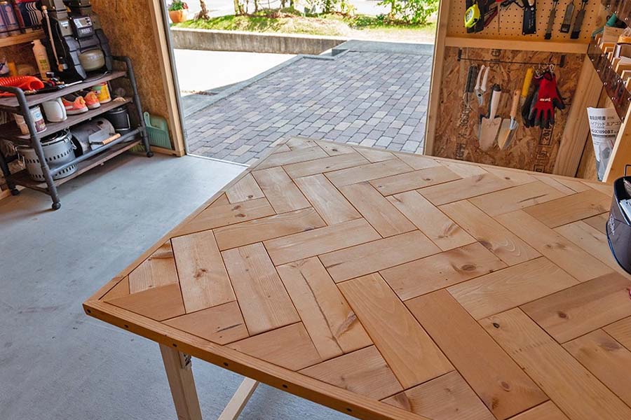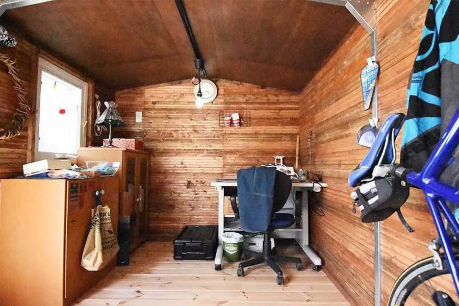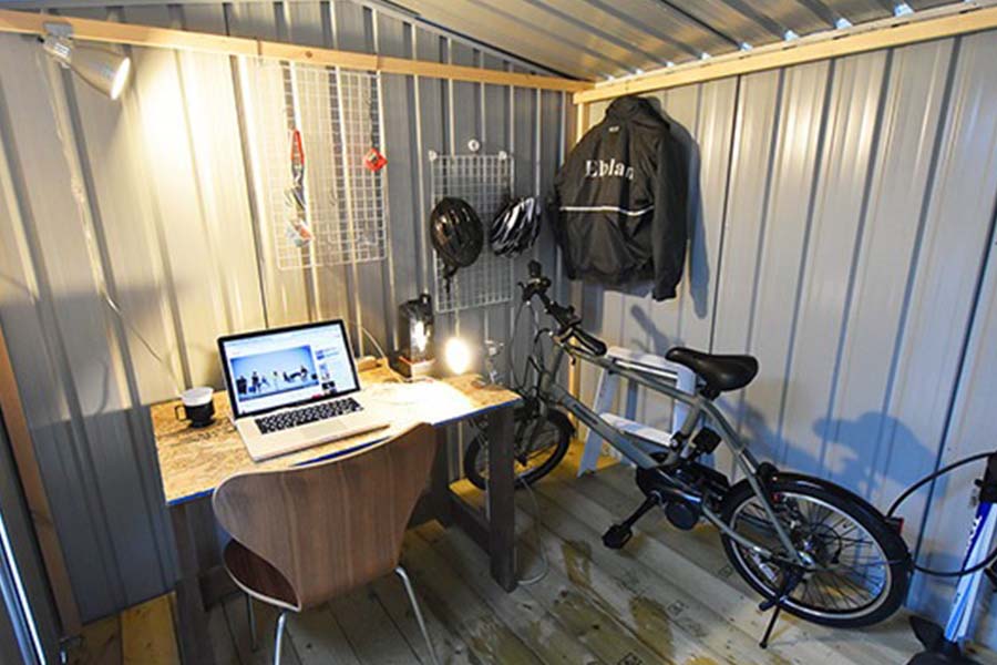 収納以外の使い方もできるユーロ物置®は、作業空間を作ることも可能。簡易的な折り畳みテーブルや椅子を置くだけで、天気を気にせず作業に没頭できます。