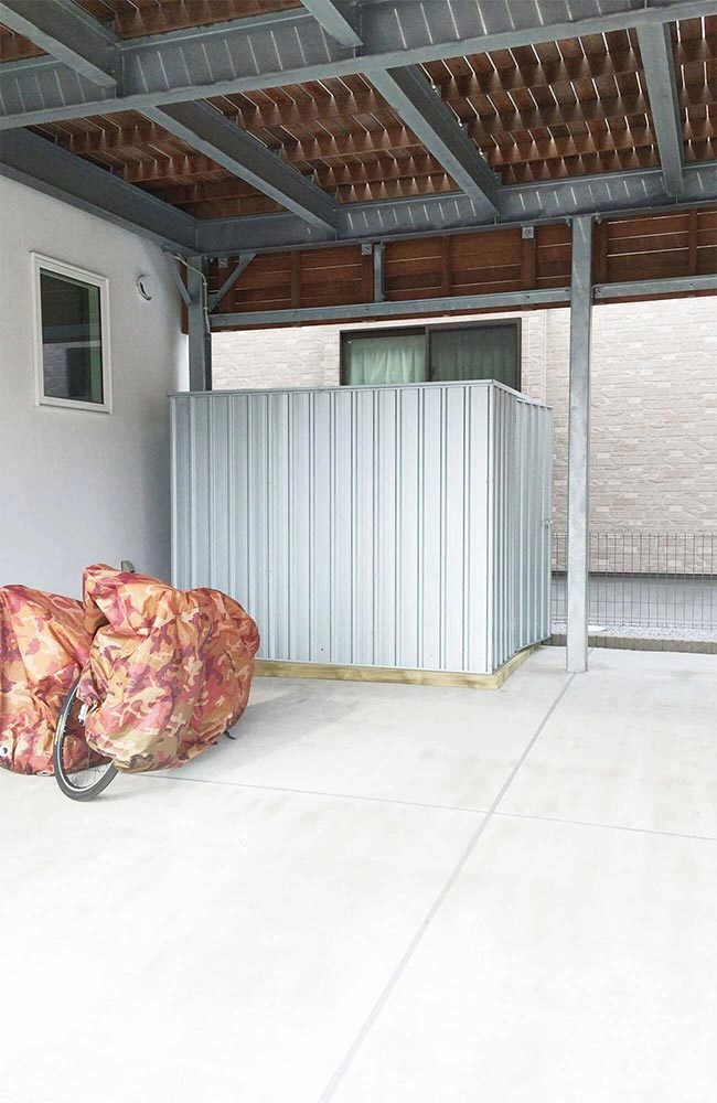 駐車場・カーポートの下に設置したので木製床に加工を加え、水平をとっています。