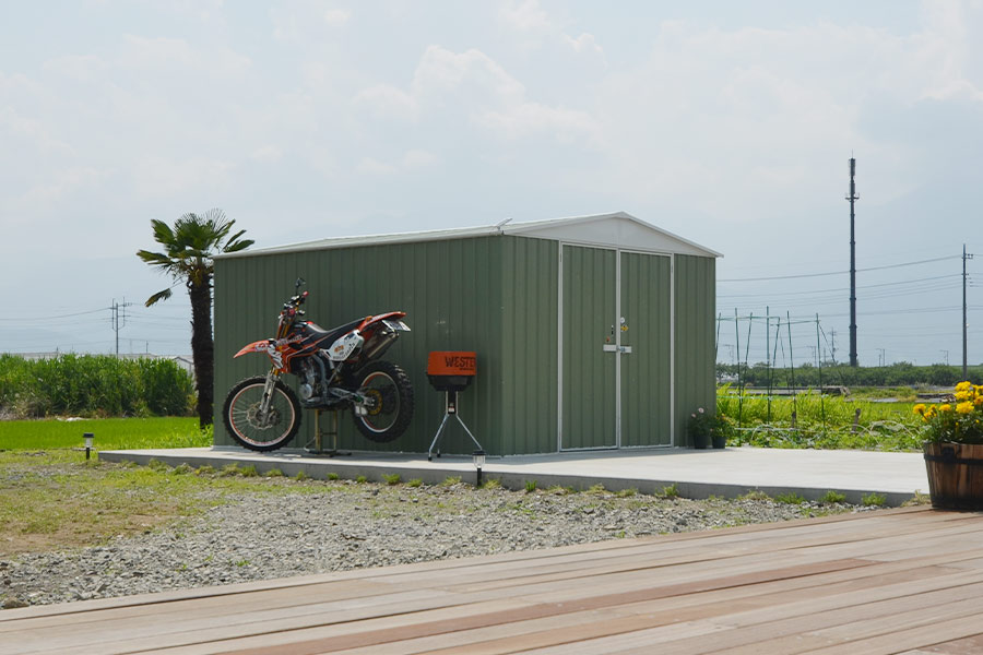大型の物置は、バイク保管の他にも作業空間をしっかり確保できる広々としたデザインで大人気。確認申請不要で、申請期間を待つことなく建てられるのが4523WK2の大きなメリット。(※設置地域によっては確認申請が必要な場合もあります)