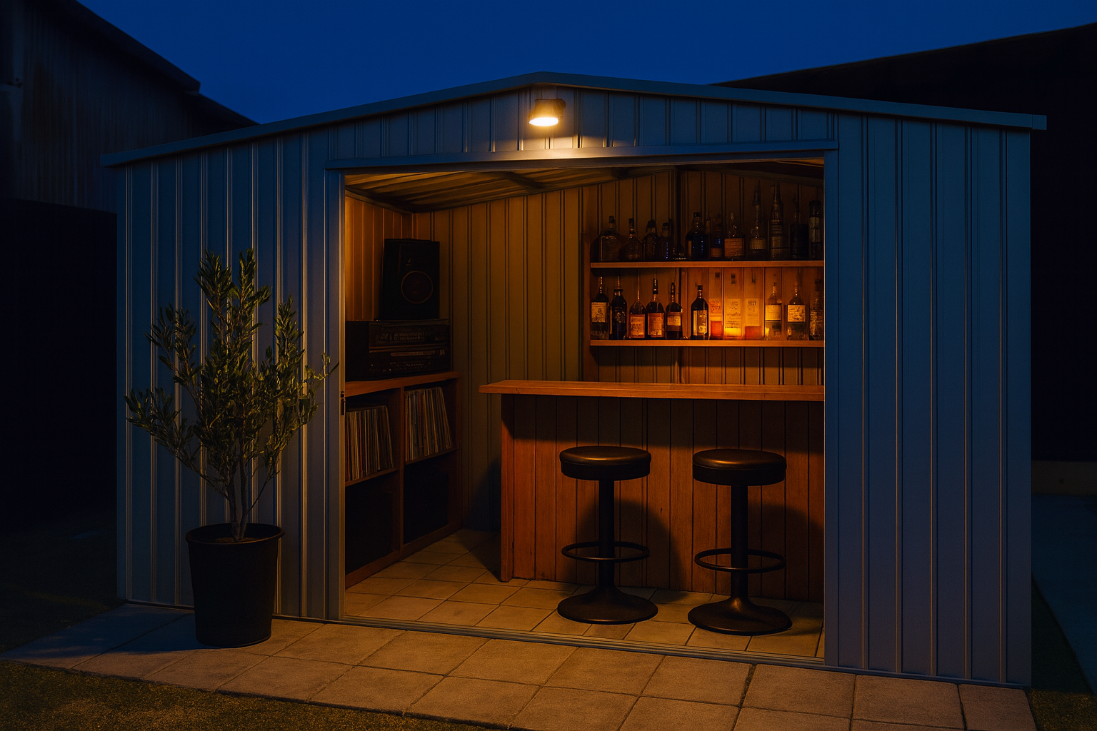 小屋をバーに変えて、友達や家族を招待して楽しいひとときを過ごしましょう。バーカウンターや快適な椅子、音響システムを設置し、屋外でリラックスしたエンターテイメントを楽しむ場として利用します。