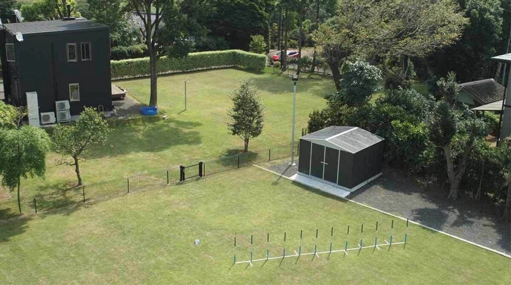 「ドッグアジリティの道具って昔は全部木で作られていたんですけど、ここ5.6年でアルミ素材のものになっていったんです。木だと朽ちていってしまうけれどアルミになったことで耐久性は上がりました。でもアルミとは言え、大切な道具を野晒しにするのは汚れてしまうので、収納する物置が必要になりネットで探し始めました。