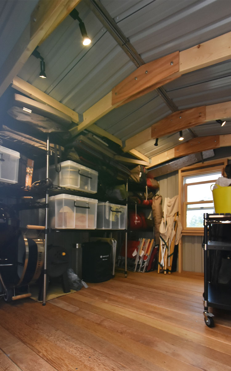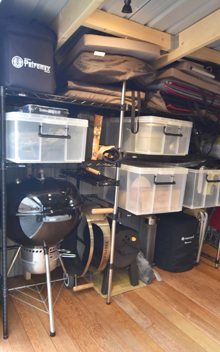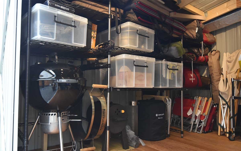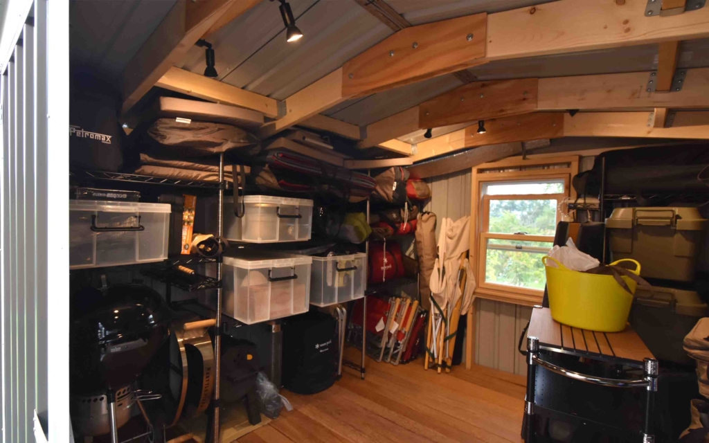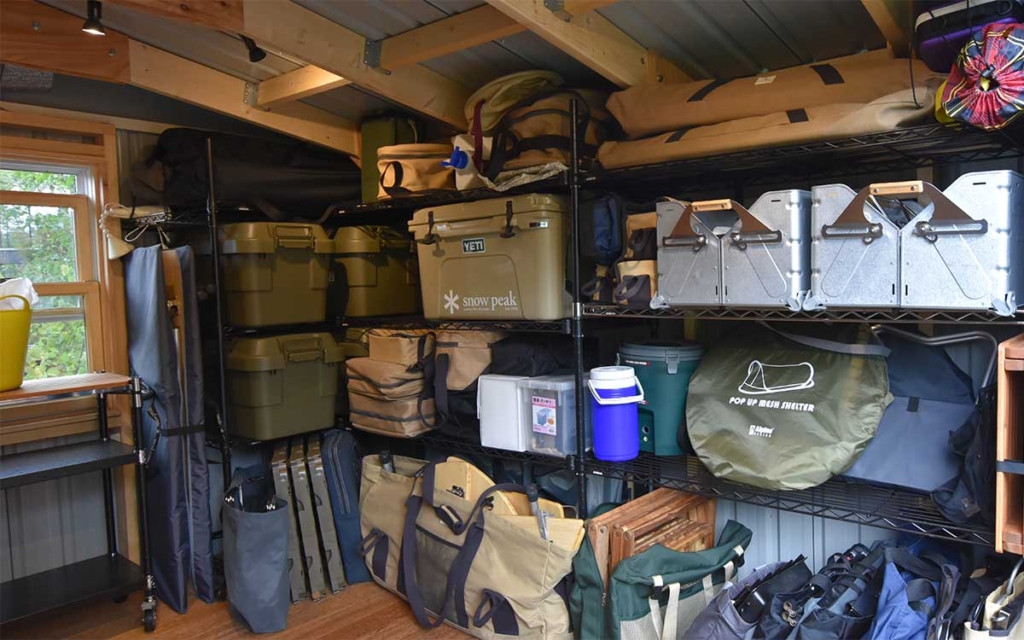 元々、キャンプが大好きで20年くらいやっています。東京ではこのユーロ物置の倍くらいのコンテナを借りて、そこに荷物を入れていました。東京にいた頃は、キャンプグッズがもっと多かったですが、大分処分して今は半分くらいになりました。