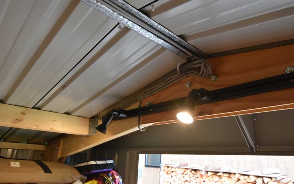 夏はこの物置をテレワークスペースとして使用していました。スタジオみたいでいいですよね。テレワーススペースとして使用するために電気も通しました。電気は電気屋さんに依頼して、母家から配線をしました。物置の庫内に窓も取り付けました。窓があると全然違いますね。