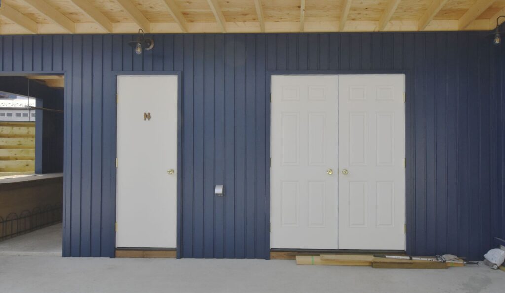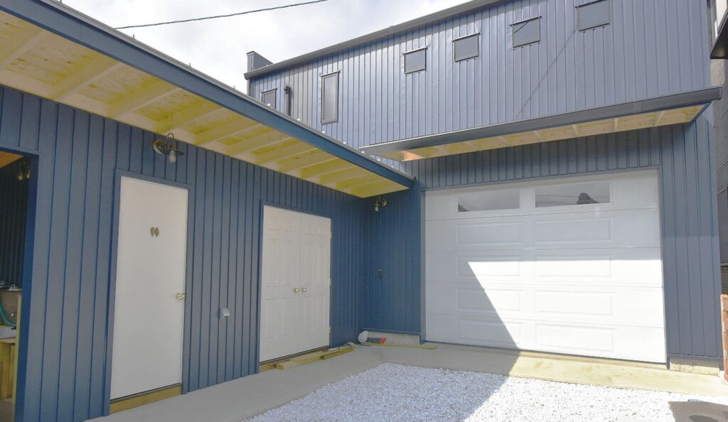 物置小屋側から見るとこんな感じです。こちらにもガレージドアがついています。